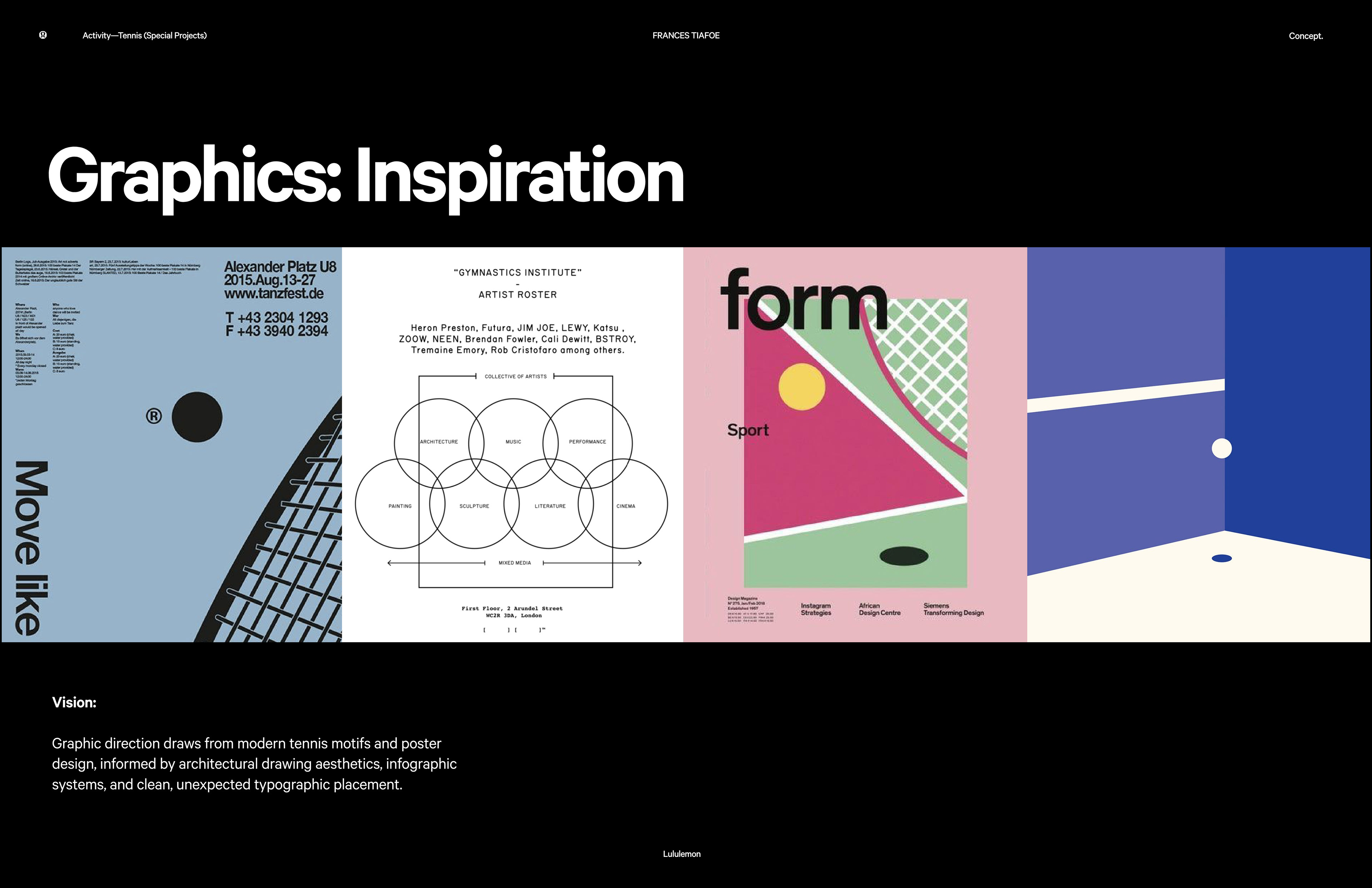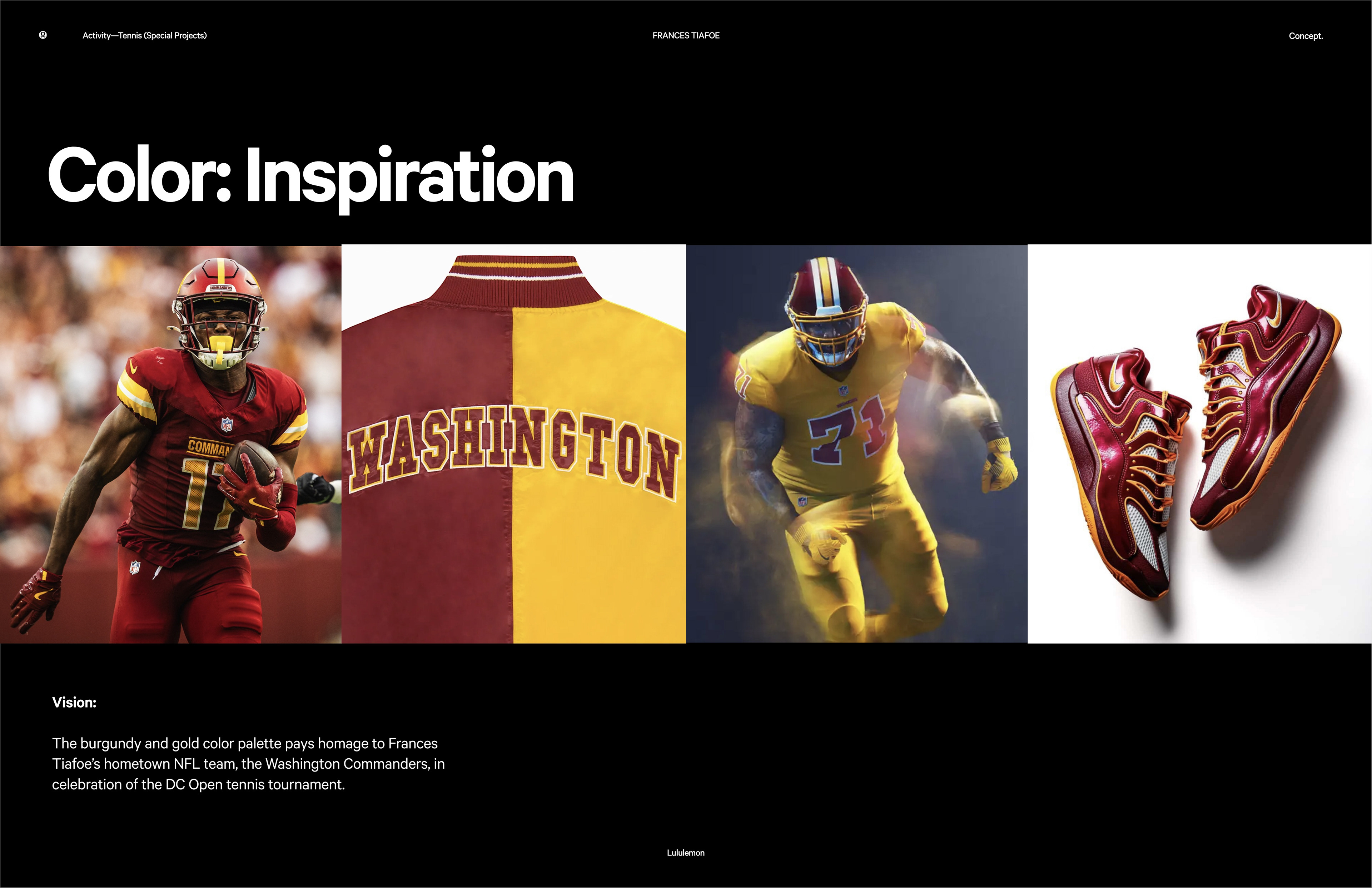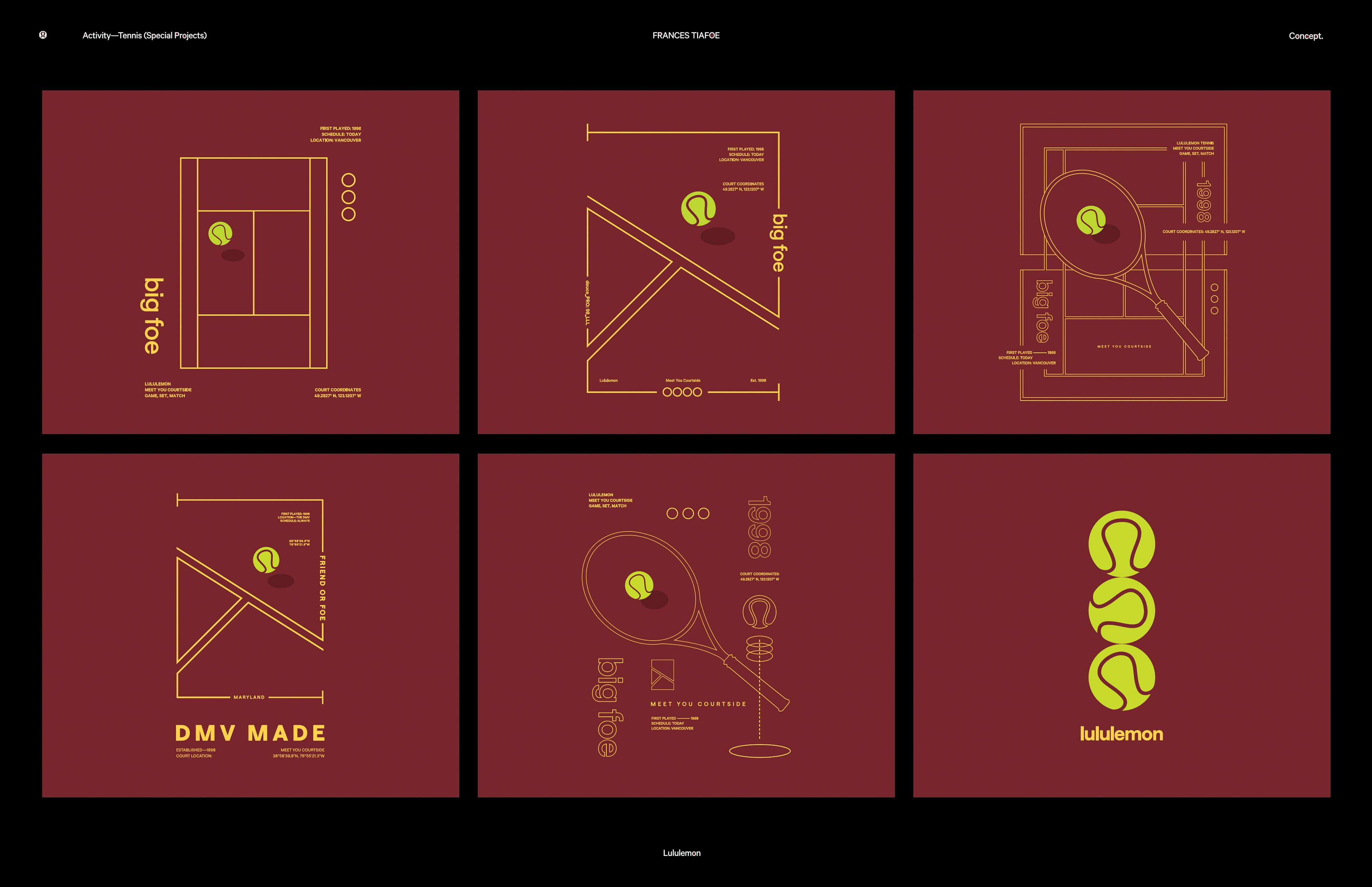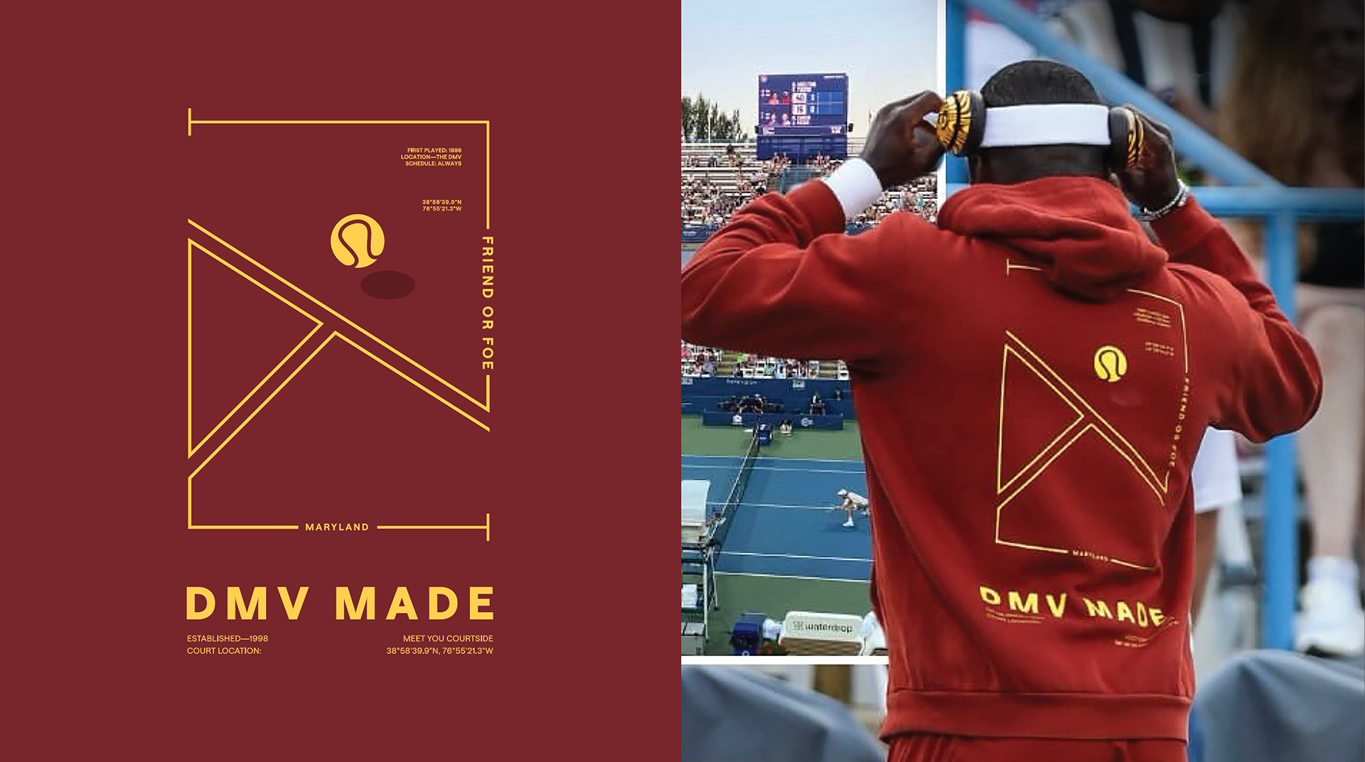 Custom tennis apparel graphics designed for Frances Tiafoe, more affectionately known as “Big Foe.” These graphics take inspiration from modern typography, architectural schematics, and infographic language. Within the design, subtle narrative details highlight Tiafoe’s journey, from his roots in the DMV (District of Columbia, Maryland, and Virginia) to coordinates referencing his childhood tennis club.