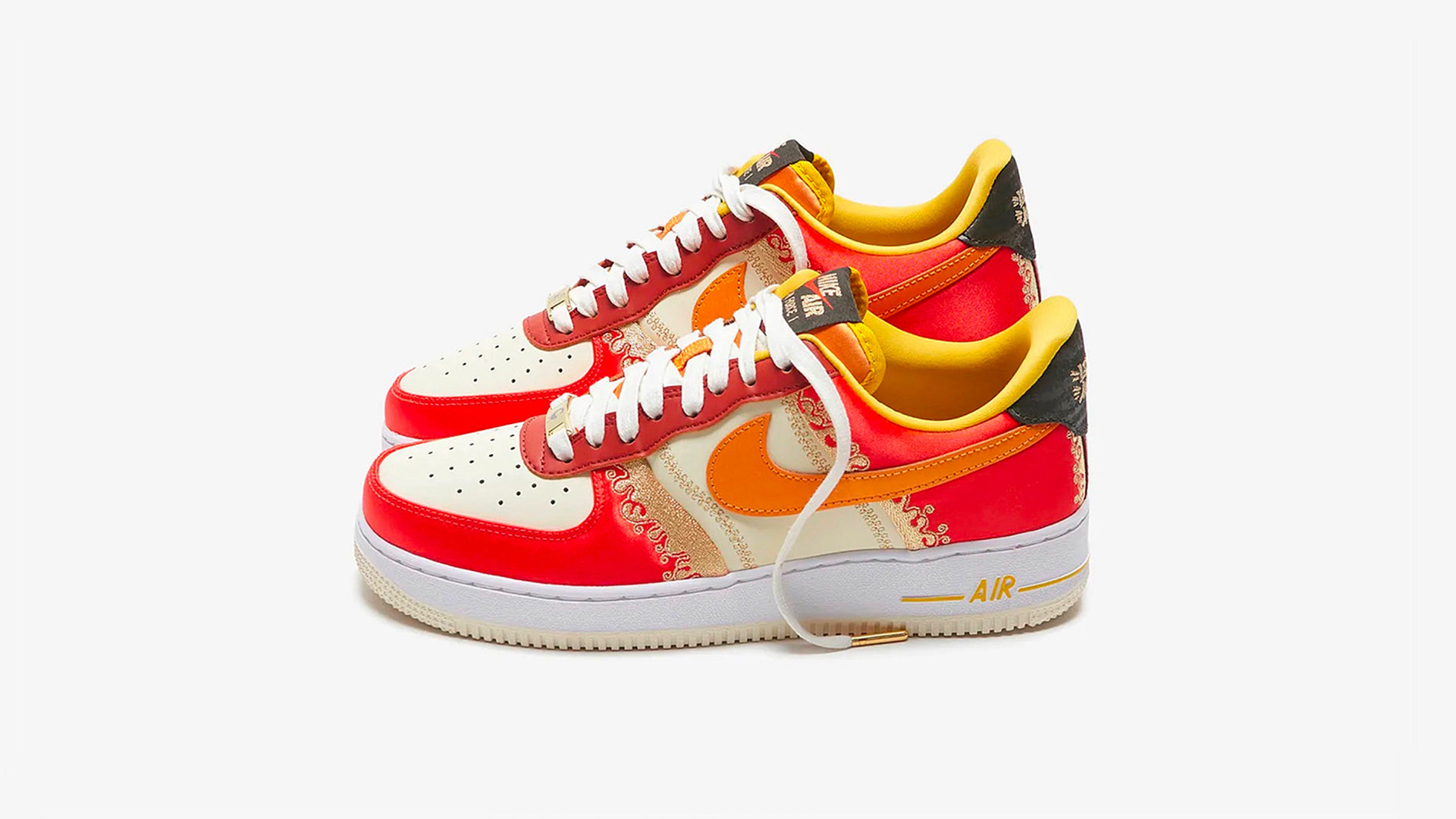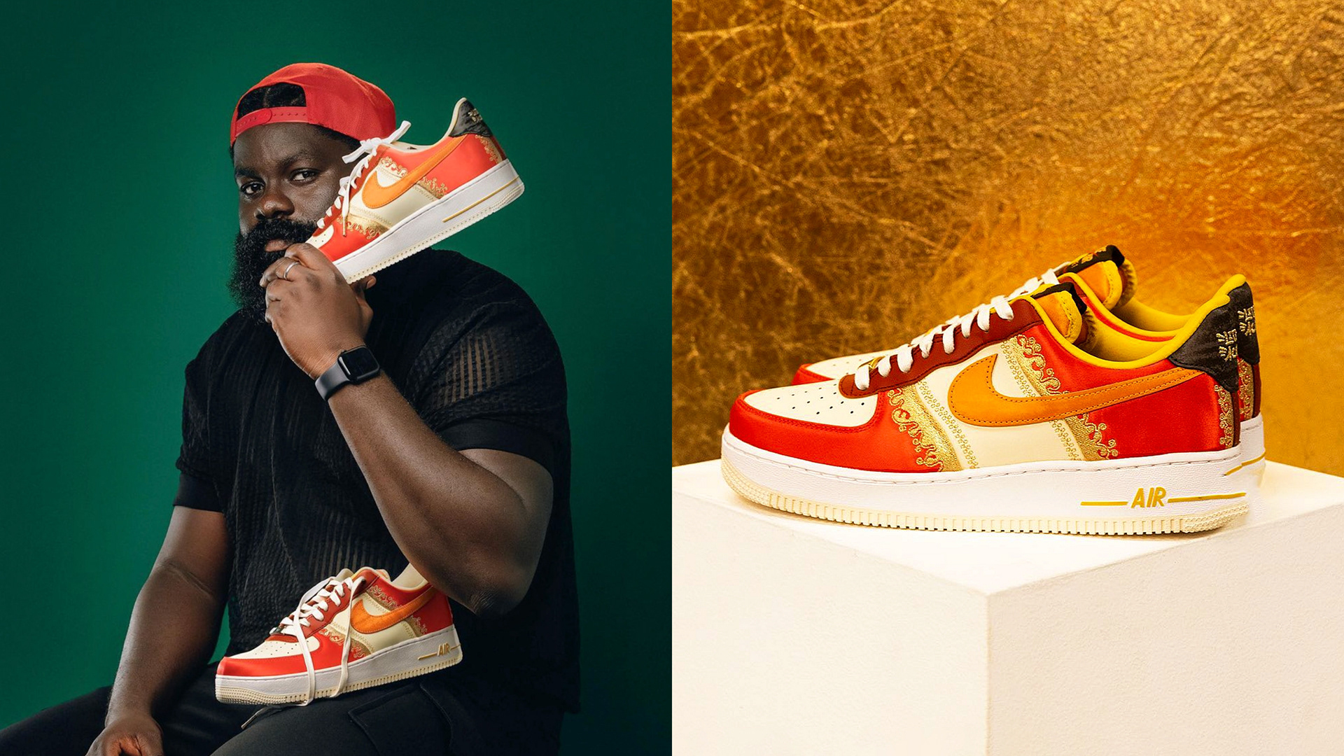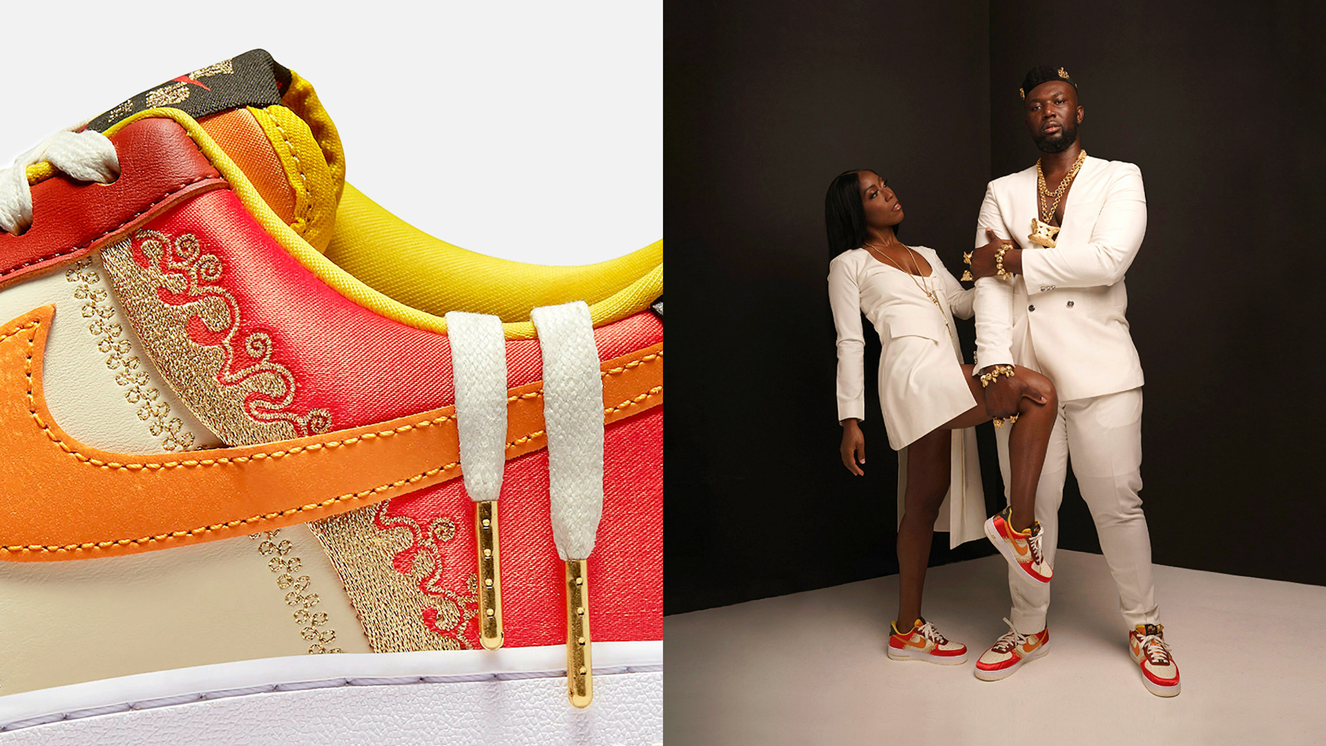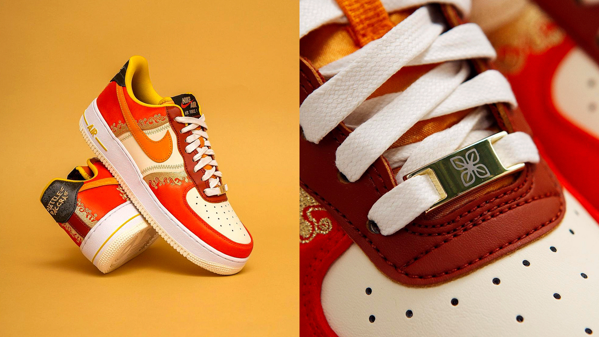 From Ghana to the world, the Air Force 1 "Little Accra" celebrates the bond between the Bronx neighborhood and the greater African diaspora. Adorned with premium leather, satin overlays and lavish embroidery, this 40th anniversary Air Force 1 honors the music, food, art and fashion shared between communities. Gilded dubraes don Ghanaian symbols that speak to "coming home" and "building community."