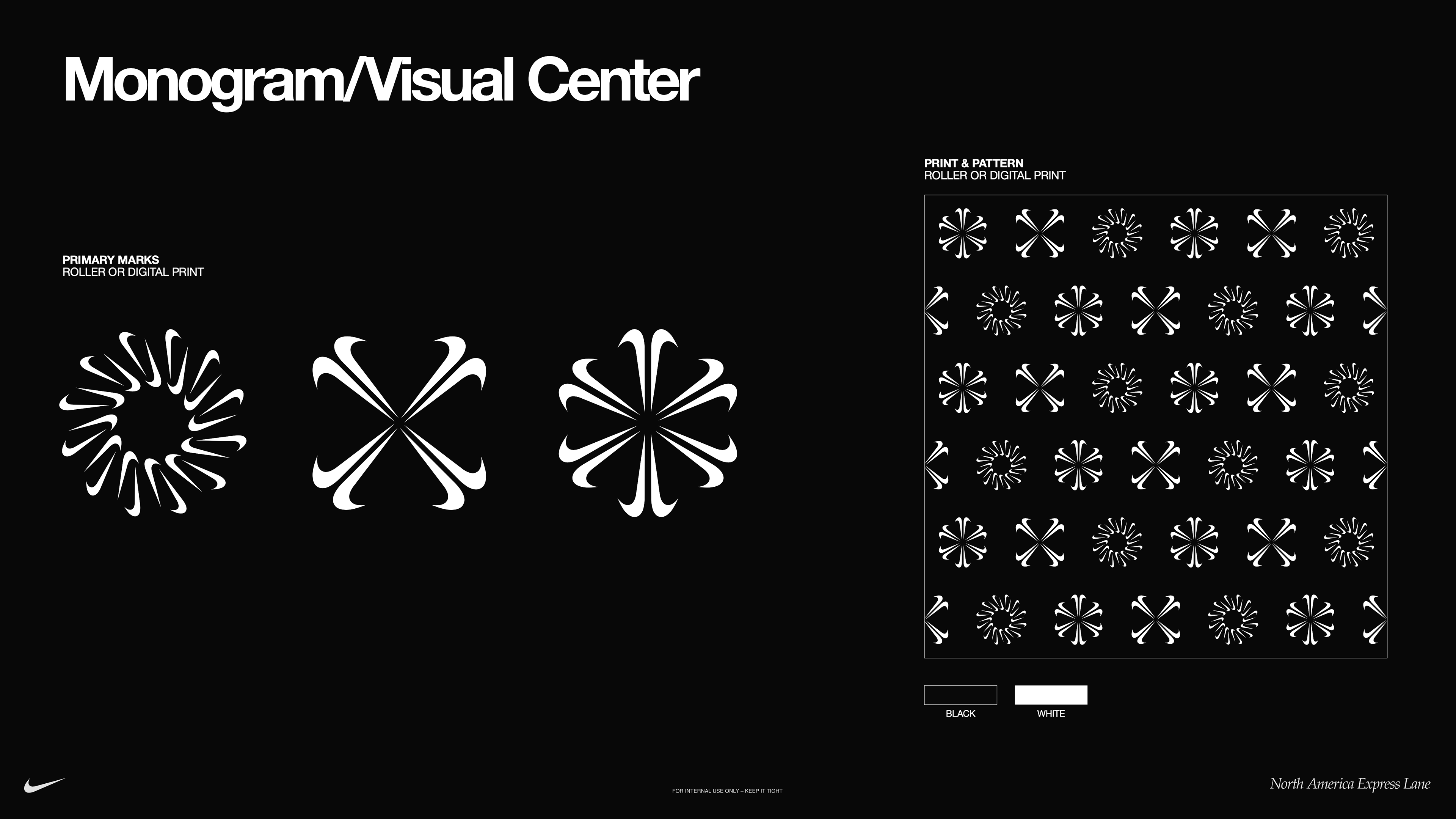Below are visual explorations of shape and pattern built entirely from the Nike Swoosh as the singular graphic unit. The intent of this apparel graphics project was to push repetition and iteration, uncovering new and unexpected patterns through variation of shapes built with the swoosh.
