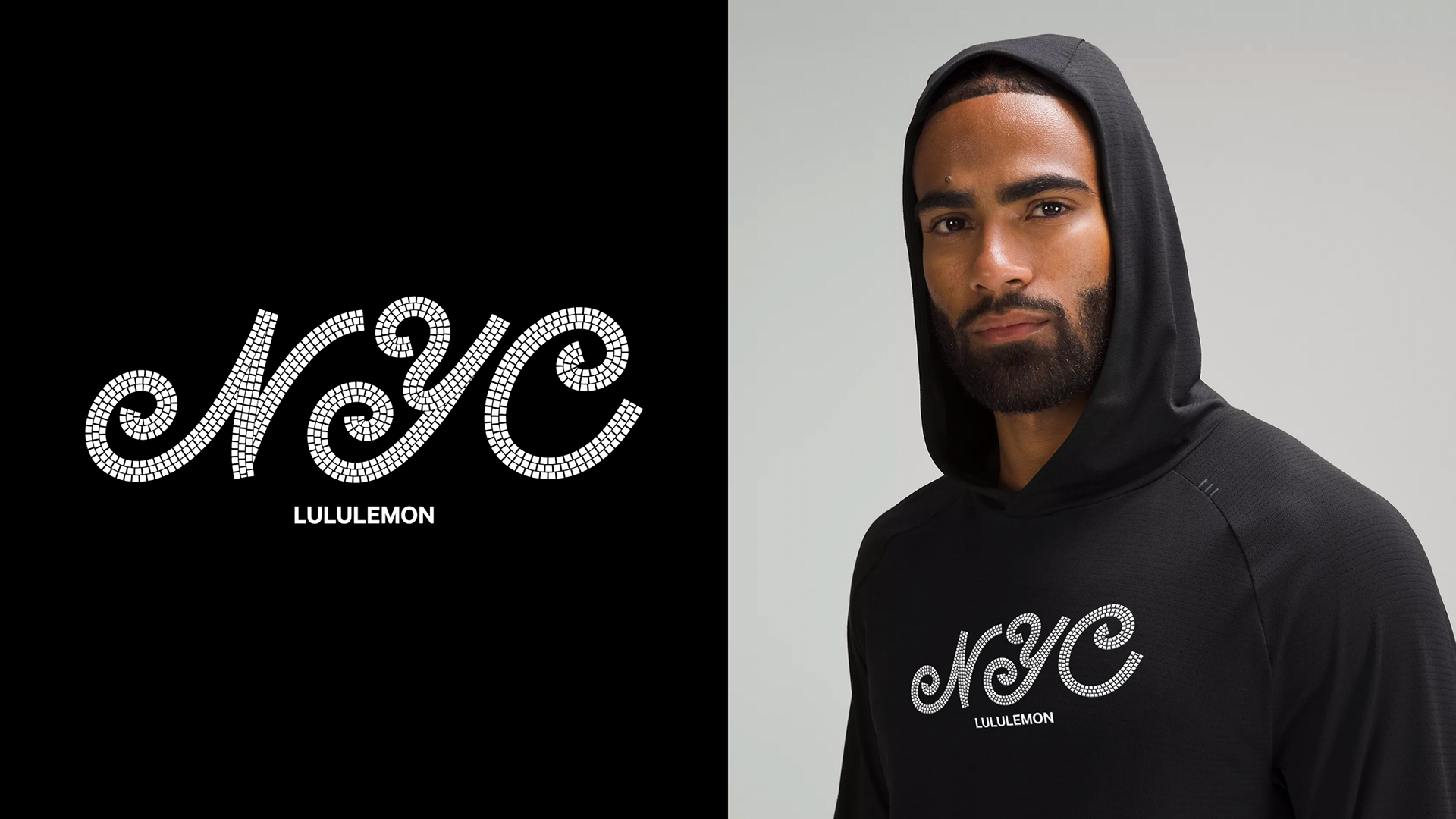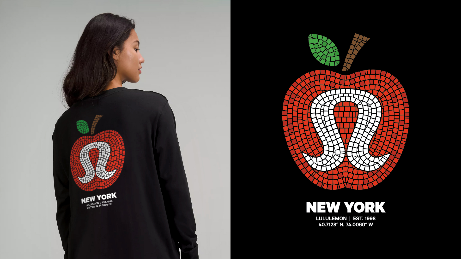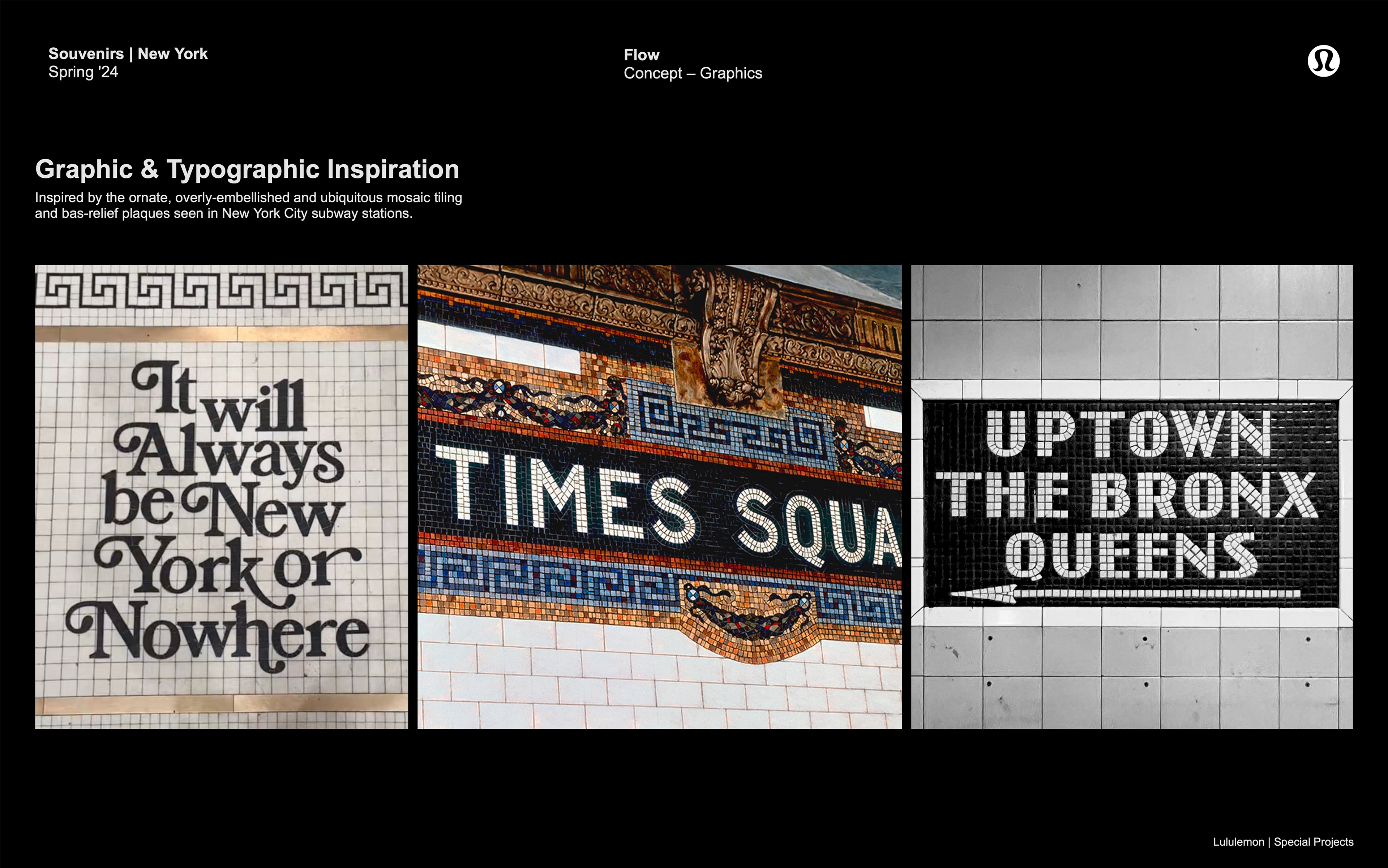 Tiled artwork and custom mosaic typography designed as apparel graphics exclusively for Lululemon New York, inspired by the ornate mosaic signage of NYC subway stations.
